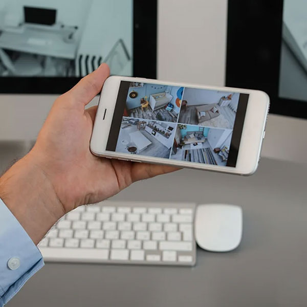 Recommended Stock Image: A person viewing security camera feeds on a smartphone or laptop, a multi-camera dashboard display, or a modern control room setting.